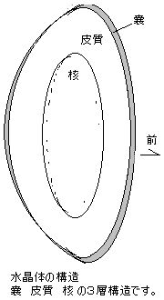 HOME > 白内障 > 2、水晶体の生理2、水晶体の生理---その水晶体ってどこ?どんなもの?何をしてるの?虹彩のすぐ裏に位置してます。 生理的には、透明で ふにゃふにゃで柔らかい碁石のような感じの物体です。中身は 嚢 皮質 核の3層構造です。果物の皮実種にたとえられます。 ![]() 役割はカメラのレンズ、ビデオカメラの自動焦点レンズに相当しますね。 厚くなる薄くなるを繰り返して、常に外界の物体にピントをあわせています。 網膜にピントのあった映像を送り込んでいます。 遠方をみたときは薄く、新聞をみたときは厚く変化します。 年齢とともに弾力が減ってきて、変形しずらくなりますが、これが老眼の主原因ですね。年齢とともに 特に中央の種に相当する部分がまず硬くなってきます。これが 水晶体核硬化現象で40歳すぎると少づつ年々変わってゆきます。 ![]() 前のページ:1、水晶体の病理、 次のページ:3、白内障の原因 |